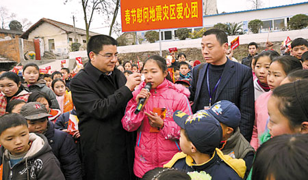 昨日下午,陳光標(biāo)率領(lǐng)由全國63位企業(yè)家組成的“春節(jié)慰問地震災(zāi)區(qū)愛心團”,來到德陽市中江縣龍臺鎮(zhèn),在龍臺中學(xué)和蘭渡小學(xué)開展慰問活動。