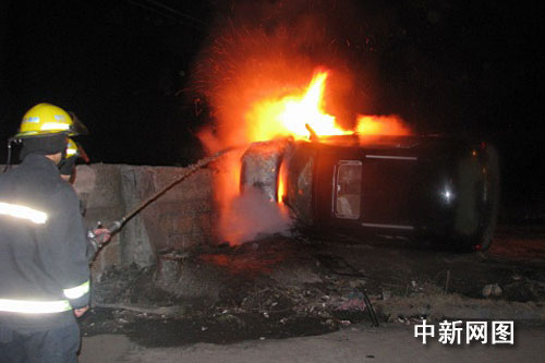 中新網(wǎng)瑞安1月24日電(記者袁爽 通訊員余根鈴)24日凌晨,在浙江瑞安市經(jīng)濟(jì)開(kāi)發(fā)區(qū)濱江大道與東港路交叉口處發(fā)生了驚險(xiǎn)的一幕。一個(gè)急轉(zhuǎn)彎,一輛北京現(xiàn)代越野車失控,撞上圍墻側(cè)翻并冒出滾滾濃煙,隨后冒出火苗,車子系統(tǒng)失靈,車門打不開(kāi),從天窗上爬出3男1女,攔下出租車,往醫(yī)院趕去。