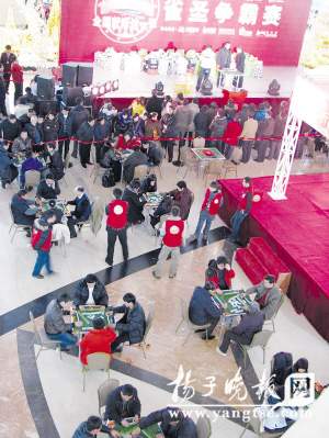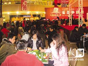 從大年初一到初三,揚(yáng)州新城西區(qū)一家大型銷(xiāo)售、娛樂(lè)廣場(chǎng)“京華城”內(nèi)分外熱鬧,這里舉行了一場(chǎng)名為“2009雀圣爭(zhēng)霸賽”的大型麻將比賽。數(shù)千平方米的大廳內(nèi),共擺下50張麻將桌,過(guò)年3天,天天人聲鼎沸。麻將這一“格調(diào)”似乎不太高的娛樂(lè)活動(dòng)能上升到“大賽”的層次,且辦出如此規(guī)模,在歷史文化名城揚(yáng)州還是“破天荒”頭一回,在全省乃至全國(guó)也屬罕見(jiàn)。昨天晚上8:20,經(jīng)過(guò)3天激烈角逐,麻將爭(zhēng)霸賽“雀圣”終于產(chǎn)生,一位來(lái)自揚(yáng)州郊區(qū)的“老太霸主”在眾人的簇?fù)碇校瑵M(mǎn)臉喜氣領(lǐng)走價(jià)值近5000元的獎(jiǎng)品。