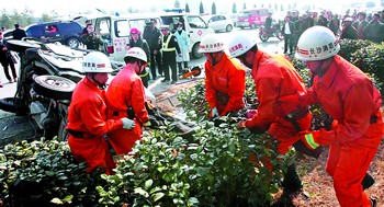 10多分鐘后,接警的消防戰(zhàn)士、解放軍163醫(yī)院的醫(yī)務(wù)人員、望城縣交警大隊的交警趕到了事故現(xiàn)場。消防戰(zhàn)士迅速用工具切割車體,將車內(nèi)傷員救出,醫(yī)務(wù)人員將傷員迅速送往醫(yī)院。由于節(jié)后返程的車輛大增,交通一度堵塞。交警迅速疏導(dǎo)交通,3名當(dāng)?shù)氐闹伟碴爢T也馬上投入到搶救傷員之中,一臺從岳陽返回廣東的吉普車路過,見此情景,一名警察也跳下車來幫助疏導(dǎo)交通,當(dāng)?shù)夭簧俅迕衽浜辖痪谑鹿尸F(xiàn)場設(shè)置警戒線……車禍現(xiàn)場雖然慘烈,但軍警民生死大營救有條不紊地進(jìn)行。