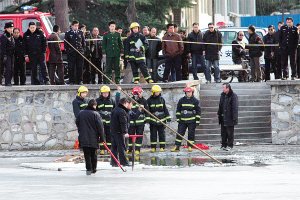 事發(fā)現(xiàn)場,吞噬了年輕男子的冰窟緊靠敬業(yè)湖南岸。公安、消防人員將敬業(yè)湖緊鄰北洋道一側的湖岸封鎖,7個民警沿著親水平臺走上冰面,用竹竿在冰下摸索著。時間一分一秒地過去,救援人員找來一塊長方形木板,當作筏子艱難地破冰搜救。一個半小時過去了,救人的“筏子”漸漸向湖心移動,搜索的竹竿在一米一米地加長,但水下沒有一點動靜。