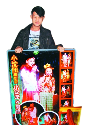每天晚上8時11分,小沈龍都會和同伴們在金萍萍二人轉劇場開演。這幾天因為過年的緣故,小沈龍他們通常會表演到晚上11時。因為小沈陽火爆的緣故,在金萍萍二人轉劇場買票的時候,工作人員都會提醒:“我們這里有一個小沈龍,和小沈陽一樣一樣的!痹谝粡埡笊蟿t印著“小沈陽模仿秀——小沈龍”。