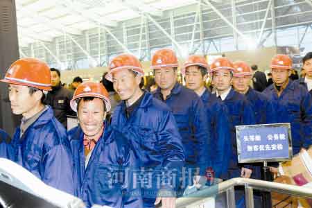 鄭州新鄭機(jī)場(chǎng)候機(jī)廳昨日來了一群身穿工作服、頭戴安全帽的農(nóng)民工,但是,他們不是來這里改造候機(jī)樓的,而是要坐飛機(jī)去海南打工。