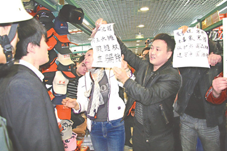 2月8日上午9點半,北京秀水街市場有限公司依據(jù)北京英特普羅知識產(chǎn)權代理有限公司向其提供的一份公證書,以涉嫌售假為名,準備對市場內(nèi)的7家商戶進行封攤處罰。但在場商戶卻手持公證處的一份“證明”,強烈質(zhì)疑英特普羅代理公司出具的售假公證存在“證據(jù)不足”,并與市場管理人員和保安發(fā)生沖突。