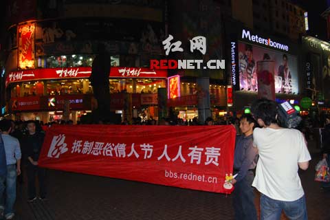 “快來看,抵制惡俗情人節(jié),人人有責(zé)!這活動真好,你還過什么情人節(jié)啊?!”12日晚上7點半,在長沙黃興南路步行街上,兩名男子拉起了一個約四米長一米寬的抵制情人節(jié)的橫幅,引起了許多路人的興趣,還有不少人上前簽名表示支持這種活動,橫幅上簽有許多秘密麻麻的支持該活動的留言,當(dāng)然,還吸引來了長沙各大媒體來采訪,也有人認(rèn)為這有作秀的嫌疑,可謂眾說紛紜。