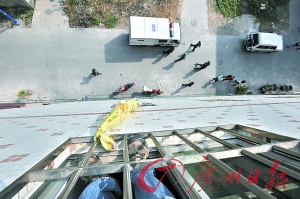 記者在案發(fā)地點南海鹽步霍邊新村一巷1號樓314房(實際為四樓),該房的一扇窗戶靠著旁邊的一條馬路。在一家小型商店的門前一攤血跡,而在樓頂則掛著一條用被單和鞋帶組成的繩子,隨風搖擺。