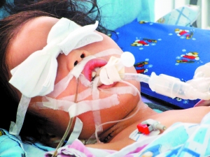 黃蓉今年6歲半,四川人。上了呼吸機(jī)的黃蓉被蒙著雙眼,躺在病床上,雖然有心跳,但對(duì)外界的刺激毫無反應(yīng)。主治醫(yī)生說,其病情危重,“已接近腦死亡”。