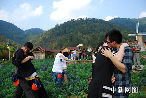 其時,數(shù)十對年輕戀人在紫色薰衣草“海洋”中以最深情最特別的花式親吻“大曬幸!,從“蜻蜓點水”到“居高臨下”、從“天旋地轉(zhuǎn)”一直到“深情熱吻”,各有捧場客,頓時贏得了現(xiàn)場游人的陣陣掌聲和歡呼聲。