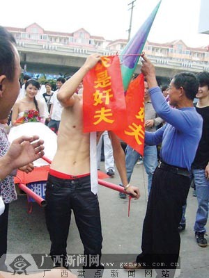 平板車接新娘,新郎畫花臉,這樣的接親方式或許大家已習(xí)以為常,可新郎和新娘身披“我是奸夫”和“我是淫婦”如此扎眼字樣招搖過市的接親方式,您可能還真沒見過。2月16日下午,南寧市街頭便出現(xiàn)了這樣一支頗為搶眼的接親隊伍。