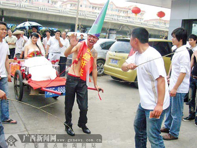 兩位新人的老鄉(xiāng)趙先生參與策劃了這次接親活動。“這樣惡搞其實就是圖個熱鬧!”趙先生告訴記者,在老家邵陽,每家人迎親時都要大鬧一番,形式不限,花樣翻新,越熱鬧越好,“有句話叫‘結(jié)婚三日無大小’,說的便是結(jié)婚那幾天不必計較輩分,誰都可以拿來惡搞。因此,新郎的父親也被拉進(jìn)迎親隊伍,甚至遭到‘鞭打’。而新郎在迎親當(dāng)天一定要吃夠苦頭,有車不能坐,要拉著新娘走,被鞭打更是家常便飯”。
