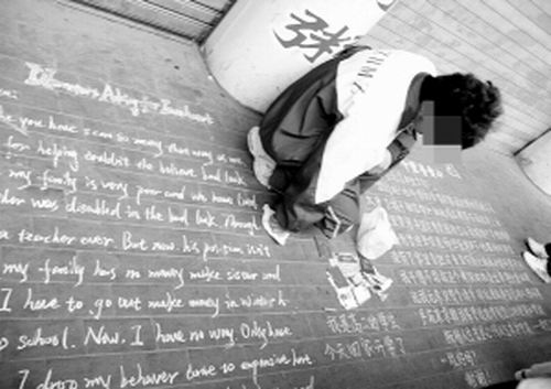 男孩的面前擺放著幾本“證件”和幾張零散的紙幣,在證件的前邊用藍色的粉筆寫著:“我是高二的學(xué)生,今天回家開學(xué)了。”在地板上,他還用中文和英文兩種語言寫了“千里尋愛心”的求助信。