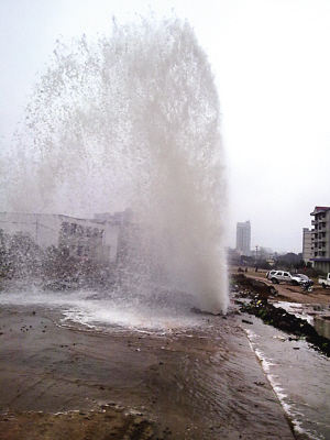 “先是聽(tīng)到吱吱吱地響,馬上要到10點(diǎn)時(shí),突然‘砰’的一聲后,一股水柱就沖上天了!60多歲的黃婆婆當(dāng)時(shí)在現(xiàn)場(chǎng),據(jù)她介紹,沖天水柱有人的大腿粗細(xì),“起碼有十多米高!