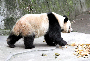 記者發(fā)現(xiàn),幾只熊貓的白色毛基本都有泛黃現(xiàn)象,特別是背部和尾部特別明顯。記者介紹網(wǎng)上帖子內(nèi)容后,飼養(yǎng)員張乃成介紹說,重慶潮濕陰雨的天氣,是造成熊貓毛色泛黃的原因之一!靶茇埾矚g在地上玩耍,免不了會沾上泥土灰塵!睆埬顺煞Q,根據(jù)熊貓毛色的干凈程度,飼養(yǎng)員會不定期為它們洗澡,但毛色是洗不掉的。冬季熊貓毛色不如夏季看起來那么亮,3、4月份換毛后,看起來就干凈多了!