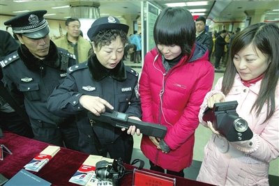 在昨天的展覽上,被查獲的違禁品裝滿20個(gè)展柜,警方在王府井站一層站廳中心用實(shí)物展柜和圖片圍成一個(gè)參觀區(qū),乘客在進(jìn)入站臺(tái)前便可以免費(fèi)參觀。