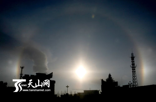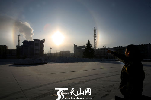 2月22日上午,在新疆富蘊(yùn)縣拍攝的“三個(gè)太陽”現(xiàn)象。當(dāng)日,富蘊(yùn)縣天氣,晴, -15 ℃ /-30℃ 。
