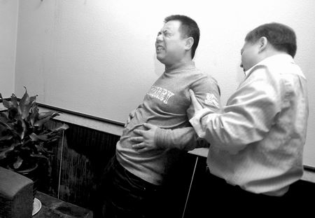2月21日下午,記者等人在鄭州市金水路的新島咖啡店見到了蔡玉建和他的徒弟釋延力。本報攝影記者陳曉東第一個要求體驗被點穴的感受,釋延力站在一邊,用手背照準陳曉東的右肋下甩了一掌,猛然間,陳曉東臉色大變,呼吸急促,木頭一般地僵在了那里。釋延力迅速用雙掌擊打陳曉東雙肩、后背并讓其彎腰吐氣……少頃,陳曉東臉色恢復正常!疤珔柡α耍稽c住后,我整個右半身麻痹疼痛,但被他拍打幾下后,這種癥狀很快就消失了!”陳曉東說。