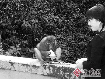 當(dāng)時(shí),兩只猴子正一前一后站在公路旁的擋墻上,一邊來(lái)回走動(dòng)啃食游客“進(jìn)貢”的食品,一邊不斷發(fā)出“;!钡暮鸾新,仿佛是在對(duì)圍觀的游人說(shuō):“快進(jìn)貢些好吃的來(lái),不然休想打此經(jīng)過(guò)。”而一旁已有數(shù)輛路經(jīng)此地的車?吭诼愤叄10余名游客正興致勃勃地圍著兩只猴子觀看,幾名膽大的游客正在接受猴子的命令,乖乖地向猴子奉上隨車攜帶的食品,以供他們享用。