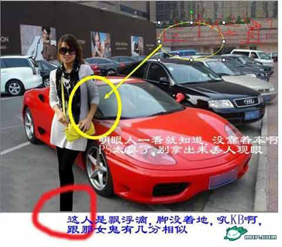 疑點(diǎn)二:從照片中女子與法拉利之間的距離,以及人與車的大小比例看,照片有明顯的PS痕跡。女子的腳甚至沒(méi)有拍進(jìn)照片內(nèi)法拉利旁的地面上,這從整個(gè)照片的拍攝角度來(lái)看,是不可能的。