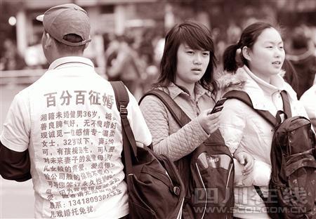 “愛(ài)情像保險(xiǎn)公司般的保險(xiǎn)不變心,與你簽訂永久性婚姻合同……”昨日中午,湖南永州人王錫國(guó)身著寫(xiě)有征婚廣告的白色短袖T恤,在成都鹽市口中環(huán)廣場(chǎng)門(mén)口征婚。市民對(duì)此議論紛紛,有人說(shuō)贊賞他尋愛(ài)的勇氣,但多數(shù)人說(shuō)他“有毛病”。