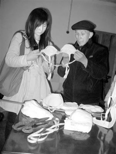 傍晚,大爺在桌子上堆起一大摞成品胸罩,都是樣品。大爺說:“從4寸到8寸的都有,你看這做工!”“我只懂A杯、B杯啊!”說完這話的劉梅,看到大爺一臉茫然。傳統(tǒng)的尺寸和現(xiàn)代的“杯標(biāo)準(zhǔn)”成為老少兩代人的第一道難題!熬褪菑淖钚〉阶畲舐,簡單,下來慢慢換算!3人和冉大爺?shù)溺蹆合敝艽蠼阋黄鸺?xì)化即將開始的工作。周大姐當(dāng)“打工”,兩個(gè)同學(xué)負(fù)責(zé)把信息上傳貼吧并建起一個(gè)網(wǎng)店。“25-80元一個(gè),純棉面料環(huán)保,手工制作個(gè)性,對于一大一小或單邊的客戶更是長項(xiàng)!边@是他們初步的網(wǎng)絡(luò)宣傳詞。