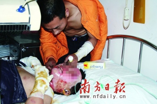 還來(lái)不及驚叫,母子倆周身便被大火包圍。離開(kāi)不到半小時(shí)的父親想不到,家中一切已付之一炬。他當(dāng)然來(lái)不及多想,立即將衣服正在燃燒的妻子抱到水池邊,接過(guò)水直接潑向妻子,之后是9歲的小中林。消防車(chē)和救護(hù)車(chē)很快到來(lái),火勢(shì)得到控制,而這一家三口也被送到武警醫(yī)院。