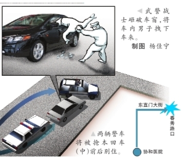 知情人透露,那輛本田車被搶后,該車司機(jī)立即撥打110報(bào)警,北京警方隨即向附近所有執(zhí)勤的民警、武警、警車發(fā)出圍堵命令,在全城范圍內(nèi)堵截這輛黑色本田車。上午10點(diǎn),一輛武警巡邏車和一輛110巡邏車按布控指令行駛到東直門內(nèi)大街時(shí),發(fā)現(xiàn)了正在瘋狂逃竄的本田車,兩輛巡邏車立即鳴響警笛一路追去,并最終將本田車別住,抓獲犯罪嫌疑人。