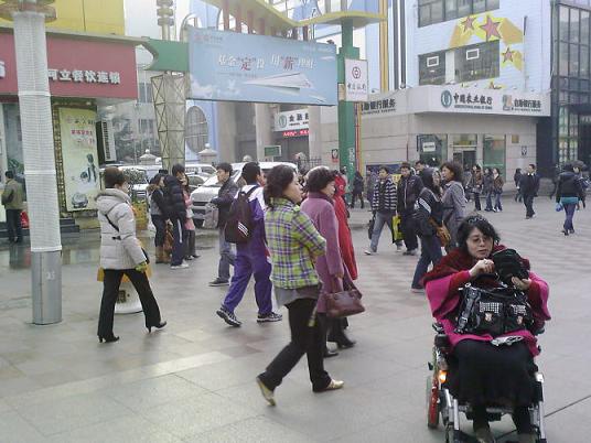 “救救這個(gè)22歲的新娘子吧,謝謝你的愛心!睔埣踩藙⒈淖妱(dòng)輪椅在青島市區(qū)為白血病新娘高俊峰奔走呼告,籌集“善款”。