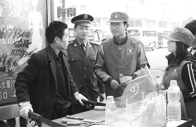 昨日首次“上崗”2小時(shí),這群大學(xué)生“城管”共勸阻占道經(jīng)營(yíng)、流動(dòng)攤販17處,清除“三亂”牛皮癬34處。(記者 夏瓊 通訊員 葉火生 李梅)(記者 蔡曉智 通訊員 李梅 攝)
