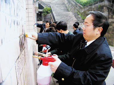 手拿刷子、噴水槍和抹布,公務(wù)纏身的書記、縣長(zhǎng)親自動(dòng)手清除城市“牛皮癬”。3月13日,一網(wǎng)友在大渝網(wǎng)三峽吧發(fā)出的帖子《云陽書記縣長(zhǎng)走上街頭清除“牛皮癬”何需親歷親為?》,引發(fā)網(wǎng)友熱議。有網(wǎng)友不解,書記和縣長(zhǎng)何必在百忙之中對(duì)此“小事”親歷親為。從山東到云陽交流任職的云陽縣委書記李洪義昨日介紹說,云陽縣正在創(chuàng)建國(guó)家衛(wèi)生縣城,他希望通過自己的行為,號(hào)召大家一起關(guān)心城市環(huán)境。