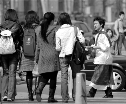 這家比薩店位于北京第二外國語學(xué)院北門,扮成“小沈陽”的服務(wù)員在北門十字路口發(fā)傳單,許多學(xué)生從他身邊走過時紛紛回頭。“遠(yuǎn)看還挺像的”,二外的孫同學(xué)說,自己和同學(xué)進去試吃了傳單上的“蘇格蘭打鹵面”,感覺和西餐中的意大利面差不多。