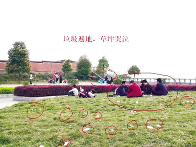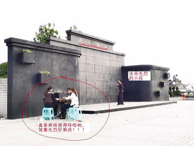 天涯網(wǎng)友“surperdry1”稱(chēng),15日那天,春光明媚,他帶上全家人到位于江津艾坪山的烈士陵園里面緬懷先烈。進(jìn)入陵園卻發(fā)現(xiàn)麻將聲聲,雞鳴不已,并配發(fā)大量照片以證實(shí)自己的話(huà)。此帖一出,立即引來(lái)網(wǎng)上熱議。烈士陵園怎能受到如此待遇?“surperdry1”還說(shuō),盡管草坪上有石碑警示路人“請(qǐng)您尊重安息在陵園內(nèi)的革命英烈,用文明的言行維護(hù)陵園的莊嚴(yán)肅穆”,但游人仍然我行我素。