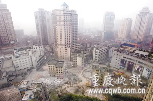 “轟!”昨天早上8點(diǎn),伴隨著一聲巨響,江北觀音橋商圈渝北二村二號(hào)地塊的6棟居民樓瞬間倒塌,整個(gè)過程僅有1.5秒,絲毫未影響到周圍密集的居民區(qū)和各種管網(wǎng)。據(jù)悉,這是今年我市危舊房改造的第一爆,爆破原址將建200多米高五星級(jí)酒店,成為江北第一高樓。