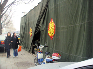 記者11時(shí)趕到分鐘寺東南角,看到在三環(huán)輔路行人道上,一個(gè)大棚支在一排修車店前。幾根金屬架子,幾塊大的深綠色厚被子搭成了這個(gè)棚子(左圖)。棚子的門口兩個(gè)大紅喜字貼在布上,棚內(nèi)左側(cè)已經(jīng)支起五個(gè)折疊桌,有兩位賓客已經(jīng)落座,右側(cè)一個(gè)大鍋正燒著旺火,并排的兩個(gè)桌子上放著雞和蔬菜,三五個(gè)人正在切肉切菜準(zhǔn)備一會(huì)兒做飯用。