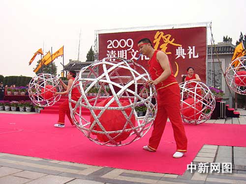 震撼的鐘鼓聲,以象征中華民族傳統(tǒng)中最高禮數(shù)的數(shù)字拉開(kāi)文化祭祀的序幕;清婉的樂(lè)聲中,配以渾厚的嗓音朗誦祭文,表演滾燈的八名小伙則身著紅色演出服手持近一人高的滾燈登場(chǎng)。最令人意外的是,紅色成為這場(chǎng)祭祀的主打色彩——紅毯、紅漆大鼓、紅色的滾燈,表演者的頸上也都戴著一條絳紅色的圍巾,現(xiàn)場(chǎng)形成了一股中國(guó)民俗濃烈的傳統(tǒng)文化氣氛。