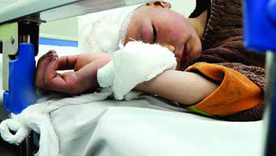 另一個受害孩子的家長楊旗中正趴在ICU病房的門口,兒子楊自炎剛動完腦部手術(shù)。為了防止孩子亂動,兩只小手被捆在了床旁的護(hù)欄上。