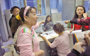 昨日上午9點(diǎn)半,醫(yī)療保險(xiǎn)管理中心渝中區(qū)分中心二樓接待大廳內(nèi)人頭攢動(dòng),在一號(hào)窗口前排隊(duì)等待辦理業(yè)務(wù)的市民多達(dá)14人,但隊(duì)伍卻不曾向前移動(dòng)半步。因?yàn)橐惶?hào)窗口內(nèi)根本不見工作人員的身影,這些市民從上午9點(diǎn)開始已經(jīng)守著空窗排了半小時(shí)。