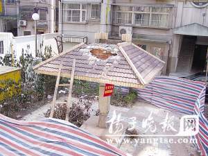 記者在該小區(qū)看到,一架爬梯搭在涼亭頂部,廢磚石塊散落一地,周圍用帆布圍起來,涼亭頂部露出兩個直徑約一米寬的大窟窿,柱子底部已經(jīng)被人鑿出凹面。該小區(qū)物管公司負(fù)責(zé)人對記者說,涼亭是上個月下旬被小區(qū)一姜姓女業(yè)主砸毀的,帆布和告示牌都是她設(shè)置的!凹依锇l(fā)生一連串怪事,后來聽人說都是因為這個涼亭壞了風(fēng)水。”38歲的姜女士對記者說,前年4月份她在該小區(qū)買了現(xiàn)在居住的房子!叭ツ8月份,小姑子12歲的兒子,星期天外出開電瓶車,出了交通事故,把腿撞斷了,一年后才把腿傷治好。還有去年丈夫在上海做廢鋼生意,虧了幾百萬元。另外,我有心臟病,身體一直不好……”姜女士說,一連串的不幸讓她心情變得壓抑。后來,她聽人講,小區(qū)里的涼亭正好對著她家陽臺的窗戶,壞了家中風(fēng)水。于是,她于2月24日喊人把小區(qū)涼亭砸了。
