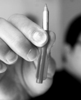 木板墻上留下很多洞孔,有類似釘子釘穿的痕跡。公司工作人員證實,這些都是歹徒用弩射擊的彈痕。記者看到,“子彈”是由3公分左右長的尖鋼釘和3公分左右長的螺旋狀紅色塑料連接而成。