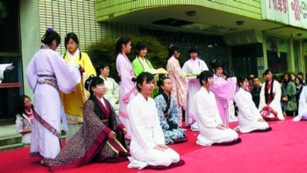 古時女子在15歲都有成人禮,謂之“笄禮”,是女性一生中最重要的禮節(jié)之一,可與婚禮并重。昨日下午,湖南師范大學(xué)五舍廣場前上演了“時空錯位”的一幕:三名妙齡美眉身著寬袍大袖的漢服,在一大群穿牛仔褲、T恤,手持?jǐn)?shù)碼相機(jī)的大學(xué)生圍觀下,集體接受了成人禮。據(jù)悉,這是湖南首次集體舉辦女子漢服成人禮。