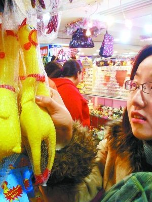 昨天下午,記者在崇文門(mén)搜秀玩具飾品區(qū)看到,至少有三四個(gè)攤位的老板都把這種慘叫雞玩具掛在了顯眼處。很多年輕人走過(guò)攤位時(shí),都會(huì)被發(fā)泄雞鮮艷的顏色、奇特的造型所吸引。不由自主地捏上一把,傳來(lái)各種各樣的慘叫聲讓人忍俊不禁。