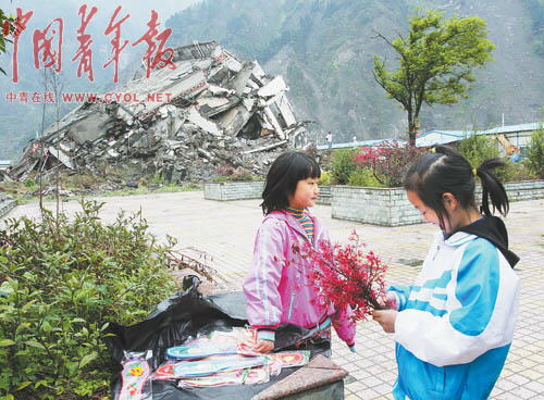 這里是映秀鎮(zhèn)“5·12特大地震”遇難者公墓,安放著數(shù)千名地震遇難者的遺體,清明前的這個周末,不少遇難者家屬紛紛前來祭掃親人。山下,賣香燭紙錢的攤點上放著的一張張地震照片讓不少人暫時停下腳步。有的照片還被做成書簽,旁邊配上自己填的詞:“憶秦娥,5·12震中,二00八年五月。西風(fēng)烈,震龍沖出火五月;鹞逶拢承泐澏!廢墟聲裂......”從城里趕回來“看”父親的彭瑞,正在仔細地端詳著照片!鞍职志褪窃谶@里遇難的!彼钢掌系膹U墟說。地震時,他在附近的漩口中學(xué)上高三,如今他已是成都一所大學(xué)的大學(xué)生。除了照片,攤點上還放著關(guān)于地震的CD光碟。守攤的小姑娘介紹,這些都是從鎮(zhèn)里的集市上批發(fā)來的,光碟里主要是當(dāng)?shù)仉娨暸_播放的地震后搶救學(xué)生的報道。“有些娃娃死得好慘啊,連我爸爸看后都哭了。”她說。
