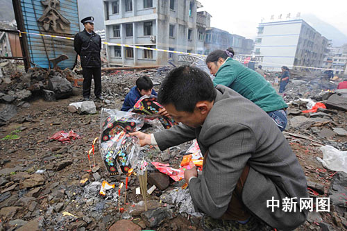 這是大地震后第一個傳統(tǒng)清明節(jié),老縣城廢墟外的封閉鐵絲網(wǎng)清晨七時準(zhǔn)默默打開,特意為此地幸存的父老鄉(xiāng)親們開放。綿綿人流回到已成廢墟的千家萬戶和學(xué)校機關(guān)等地前,焚香燃燭,捧上鮮花。只聽遍地哭聲四起,人人都向遇難親人傾吐衷腸。