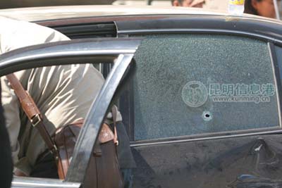 黑色尼桑車上的司乘人員已不知去向。記者注意到,尼桑車后車窗上有一圓形小孔,小孔四周的玻璃出現(xiàn)像蛛網(wǎng)一樣的大面積裂痕,很像子彈穿過的痕跡。有一名戴白色手套的男子在車周圍進(jìn)行檢查,并以警方正在辦案為由拒絕接受記者采訪。