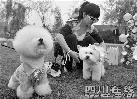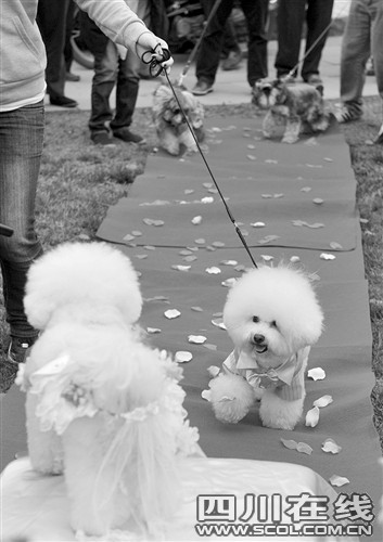 昨天下午3點(diǎn),成都非物質(zhì)文化遺產(chǎn)國家公園內(nèi)響起了結(jié)婚進(jìn)行曲,正當(dāng)市民們駐足想看下新人的模樣時(shí),兩只白色的比熊犬身穿鮮艷禮服走上紅地毯,突然闖進(jìn)大家的視野。原來,它們就是這場婚禮的主角。13套豪華禮服,紅毯花房,“狗友”證婚還有入洞房等等,一樣都不能少。主人請人專門為狗狗策劃、舉行這么隆重的婚禮,數(shù)百在場市民對此褒貶不一……