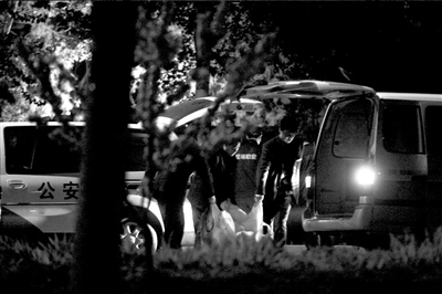 前天下午6點,在學校西側的小樹林內,學生家長和同學發(fā)現了兩具尸體。當晚,樹林旁的路邊停了十余輛警車,多名警察手持電筒、牽引著警犬在樹林內勘察,并陸續(xù)從現場提取相關證據帶離現場。由于現場太暗,警方還調來一輛照明警車。昨天零點50分左右,兩具尸體被運離現場。
