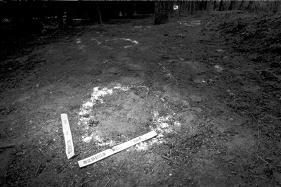 昨天上午在事發(fā)現場,警方勘察時撒的石灰粉清晰可見,一些物證袋封存條遺留在地上。在圍墻附近東西走向的灌木叢中,記者看到一處新翻的土堆,土堆上有兩處血跡。