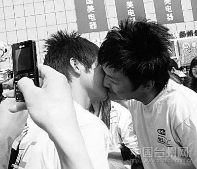 網(wǎng)友Luochen725發(fā)貼:前天下午,我剛好在路橋富仕廣場(chǎng)附近逛街,聽說有接吻大賽,就過去湊熱鬧。不看不知道,一看不得了,兩個(gè)男人在接吻,汗,有兩對(duì),頓時(shí)被雷倒了!他們還按主持人的要求擺不同的姿勢(shì),熱吻了一個(gè)多小時(shí),我暈。∏閭H參加活動(dòng)可以接受,不過對(duì)我來說,這么多人看著,覺得比較怪。而兩個(gè)大男人這么大庭廣眾之下接吻,我就真的是無語了。