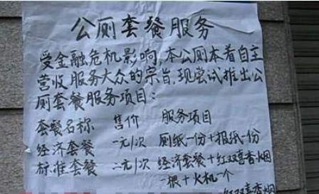 據(jù)悉,告示上將該項(xiàng)服務(wù)分為五個(gè)等級(jí),分別是經(jīng)濟(jì)套餐、標(biāo)準(zhǔn)套餐、商務(wù)套餐、豪華套餐、總統(tǒng)套餐。每個(gè)套餐還列出了各自的服務(wù)項(xiàng)目。例如經(jīng)濟(jì)套餐就贈(zèng)送廁紙一份、報(bào)紙一份,收費(fèi)也相當(dāng)?shù)土,僅僅需要一元;2元的標(biāo)準(zhǔn)套餐則在經(jīng)濟(jì)套餐的基礎(chǔ)上送出紅雙喜香煙一根火機(jī)一個(gè)。最雷人的應(yīng)該算是價(jià)值10元的豪華套餐,竟然有專(zhuān)業(yè)陪聊的服務(wù)項(xiàng)目。而20元的總統(tǒng)套餐也讓人摸不著頭腦,居然包括彩票一張和精美紀(jì)念冊(cè)。這些都讓網(wǎng)友們好奇不已:不知道當(dāng)你如廁的時(shí)候,有人在一旁陪你談心,會(huì)是什么樣的感受?而精美紀(jì)念冊(cè)的內(nèi)容,又會(huì)是什么?