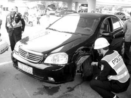 見狀,行人欲上前堵截,小車司機卻打正方向繞至北面正常車道。目擊者張先生說,當時路邊還停著一輛警用摩托,可小車司機就像昏了頭,居然還徑直往上撞。隨后倒車又撞向一處橋墩,最后車輛因輪胎爆裂被迫停下。