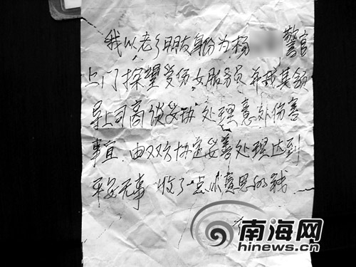 楊警官要求蔡某寫下一張收條,蔡某當(dāng)場寫道:我以老鄉(xiāng)朋友身份為楊警官上門探望受傷女服務(wù)員,并找其領(lǐng)導(dǎo)上司商談妥協(xié)處理意外傷害事宜,由雙方協(xié)定妥善處理達(dá)到平安無事,收了一點(diǎn)小意思的錢。